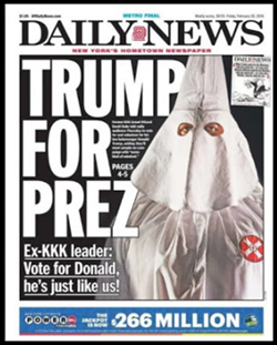 El KKK hoy en día, ha tenido un alza enorme en popularidad debido a la proclamación de Donald Trump como presidente de los Estados Unidos. Más cuando sus contactos con el Klan y la adhesión de esta agrupación al proyecto de Trump fueron conocidos y publicados en todos los periódicos del mundo |