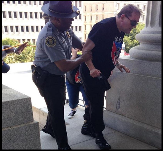 El policía afroamericano Leroy Smith ayudando a un manifestante del Ku Klux Klan