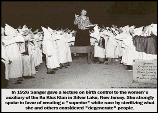 Traducción de lectura en foto: En 1926 Sanger dio una conferencia sobre el control de la natalidad a las mujeres auxiliares del KKK en Silver Lake, New Jersey. Ella habló enérgicamente a favor de crear una raza blanca "superior" esterilizando lo que ella y otros consideraban gente "degenerada". |