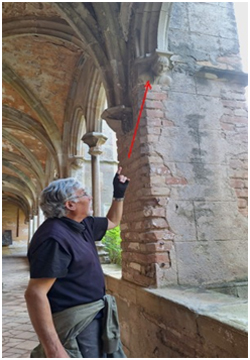 Foto: El autor, indica una de los rostros que podría ser de Cristóbal Colon, en una de las columnas del claustro |