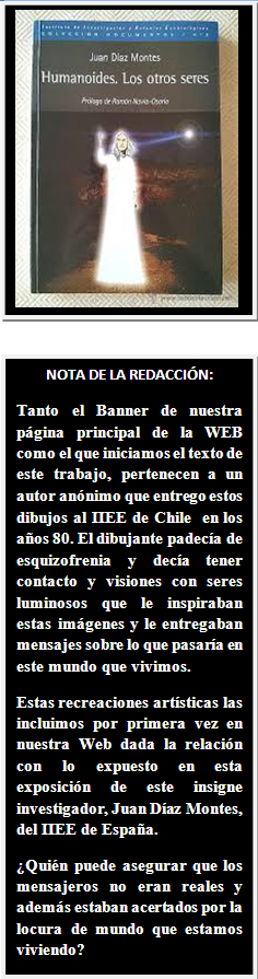 El sentido dual de todo lo que existe debe hacerse extensible -creo- conceptual mente de forma expresa al universo. No me cabe duda alguna sobre la existencia de Objetos Volantes no Identificados, muchos de los cuales han sido observados a poca distancia, con la corroboración de los testigos de su apariencia sólida, presentando una estructura firme, en muchos casos con definiciones de detalles muy precisos. Pero también se han presenciado manifestaciones luminosas increíbles, torrentes de luz y color que aparecen y desaparecen a la velocidad del pensamiento, cambiando de lugar casi instantáneamente y que en muchas ocasiones provocaron en el testigo un impacto psicológico que no pudieron superar en mucho tiempo, y que cambiaron su modo de pensar y de vivir. |