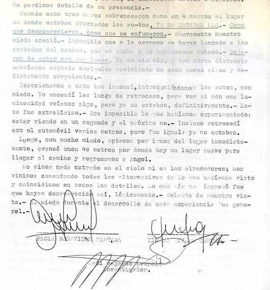“En un momento, nos dimos cuenta que al final del camino, que es ancho de ripio y recto, a la altura del segundo poste de energía eléctrica, esto es, a unos 80 metros de distancia al Sur se comenzaron a ver luces rojas, redondas, como de linterna mediana, pero que tenían un haz de luz. No era una luz brillante y el rojo era especial, como rubí. Se movía erráticamente en todas direcciones al lado del poste, a una altura media. Se encendían y apagaba. Cuando pasó hacia ese sector un automóvil, se apagó. Nosotros tratamos de ver a las personas que allí deberían estar, con su luz, pero no había nadie. Naturalmente los focos del automóvil que pasó iluminaron ampliamente ese lugar. Eso comenzó a extrañarnos y lo comentamos.